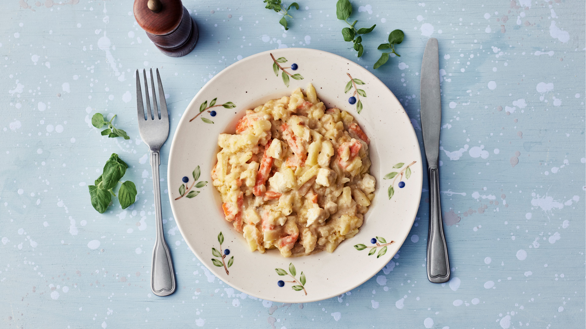 Aitous on puoli ruokaa. Siksi meidän Feta-kasviskiusauksen juusto tulee Kreikasta. Siihen kun lisätään vakallinen suomalaista perunaa Pohjanmaalta, ovat maut kevyesti sanottuna kohdillaan. Lisäksi vuokaan tulee tietenkin runsaasti tuoreita kasviksia. Reilulla kädellä kermaa ja kuumaan uuniin.
