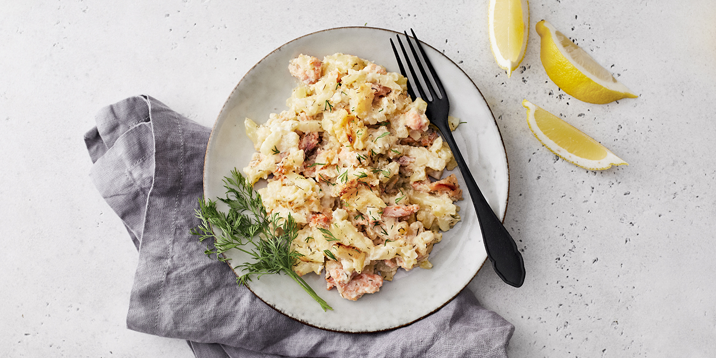 Maistuvassa arkiherkussa käytämme suomalaista kirjolohta. Lohen lisäksi siinä on kotimaista kermaa, kotimaista perunaa ja ripaus mausteita, ei muuta.