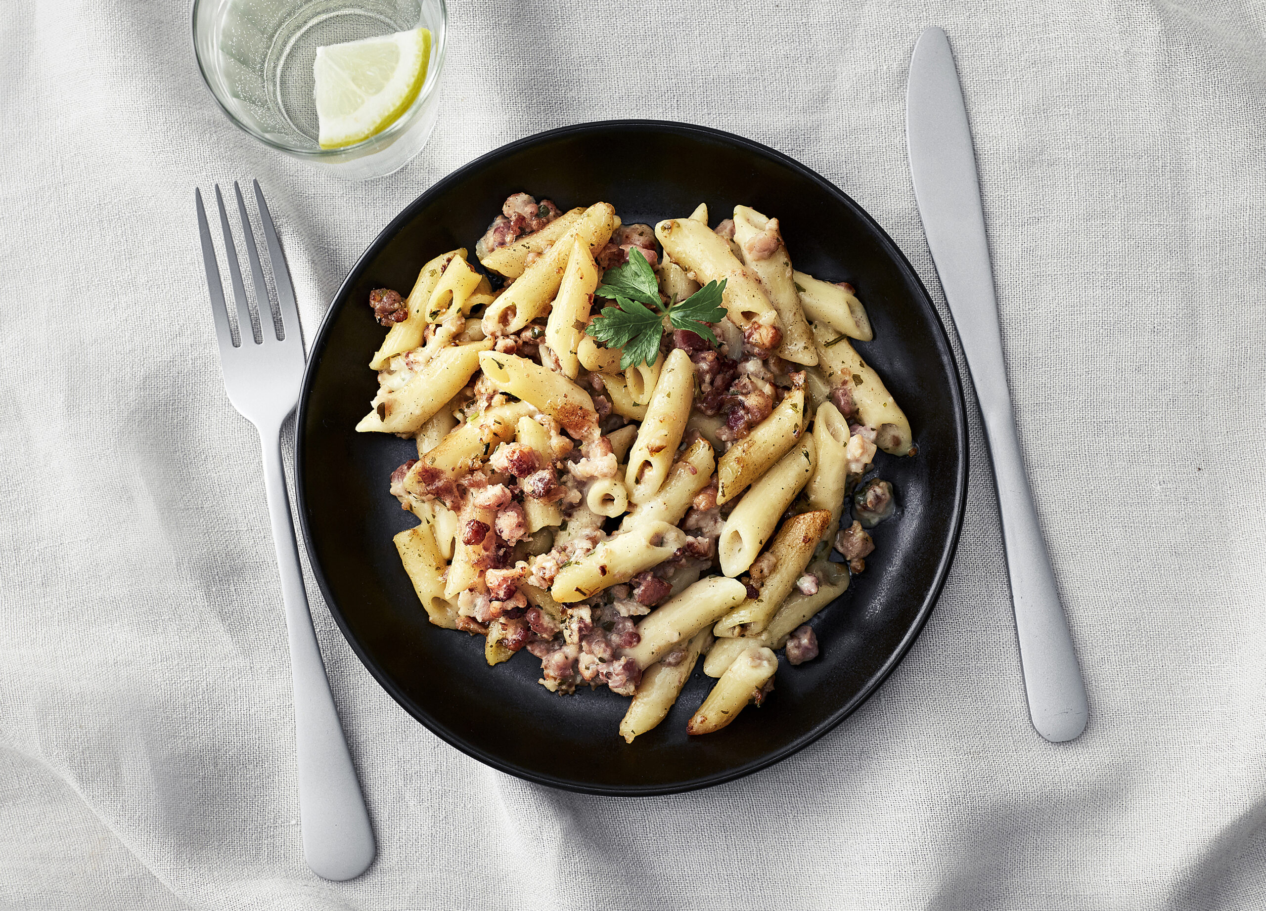 Kun ruokaa tehdään maku edellä, on hyvät raaka-aineet ihan tärkeintä. Kotimaisen pekonin lisäksi tähän tulee pastaa, kermaa ja juustoa.