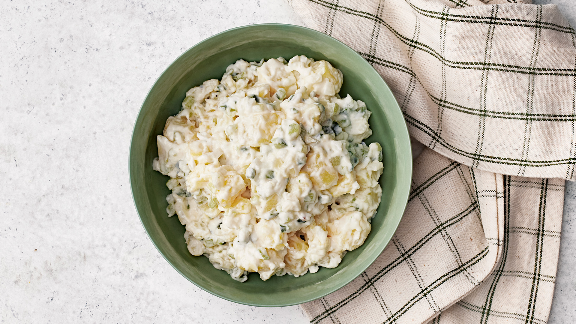 Perinteinen perunasalaatti maistuu vaikkapa nakkien ja lihapullien kanssa.