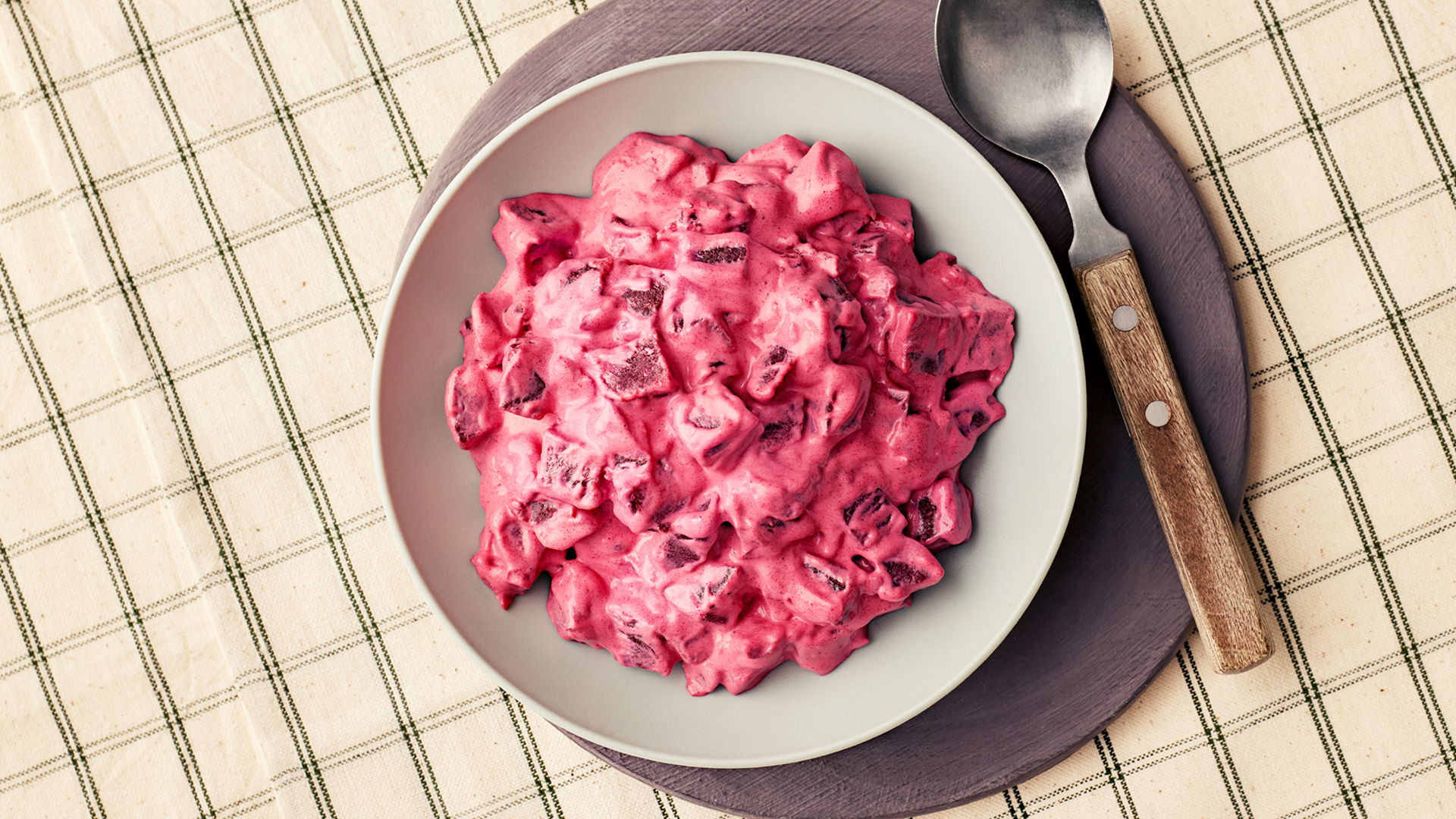 Tässäpä mukavasti erottuvaa purutuntumaa. Kunnon paloista tehty täydellinen lisuke lautaselle, mutta pysyy yhtä hyvin leivänkin päällä. Tuoretta täysmajoneesia ja punajuurta sekä passelisti mausteita.