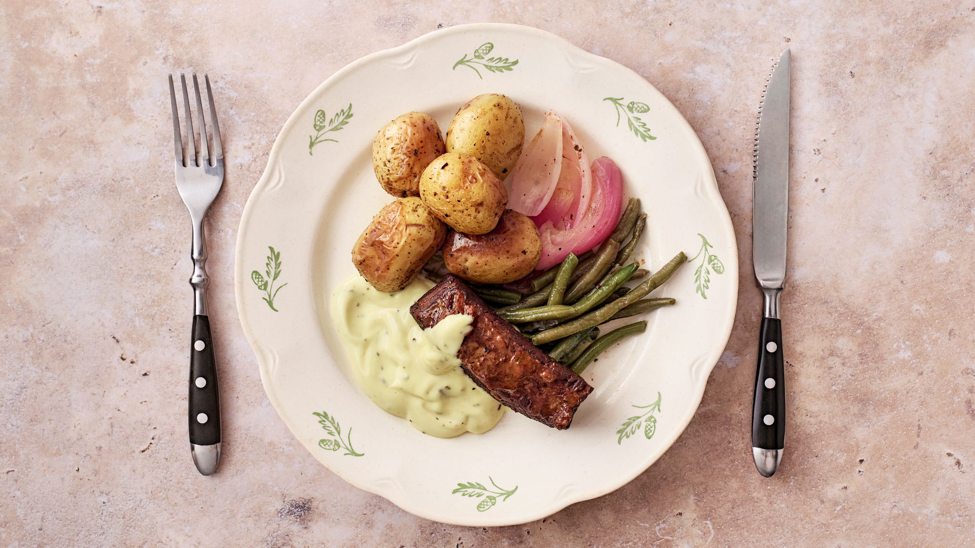 Paahdettu peruna 166 g: Peruna 96 % (Suomi), rapsiöljy, jodioitu suola, rosmariini, mustapippuri. Naudanrintaa kastikkeessa 95 g: Snellmanin naudanliha 89 % (Suomi), rapsiöljy, sokeri, maissitärkkelys, poltettu sokeri, jodioitu suola, perunatärkkelys, valkosipuli, mustapippuri, timjami, rosmariini, vesi. Bearnaisekastike 50 g: Rapsiöljy, vesi, kananmunan keltuainen, sokeri, valkoviinietikka, väkiviinaetikka, jodioitu suola, sinappi (vesi, sinapinsiemenet, etikka, rypsiöljy, suola, mausteuute (kurkuma)), rakuuna, säilöntäaineet (E211, E202), kurkuma, valkopippuri. Basilikapavut 29 g: Vihreä papu (EU), rapsiöljy, valkosipuli, jodioitu suola, basilika, mustapippuri. Pikkelöity punasipuli 20 g: Punasipuli, vesi, sokeri, väkiviinaetikka.
